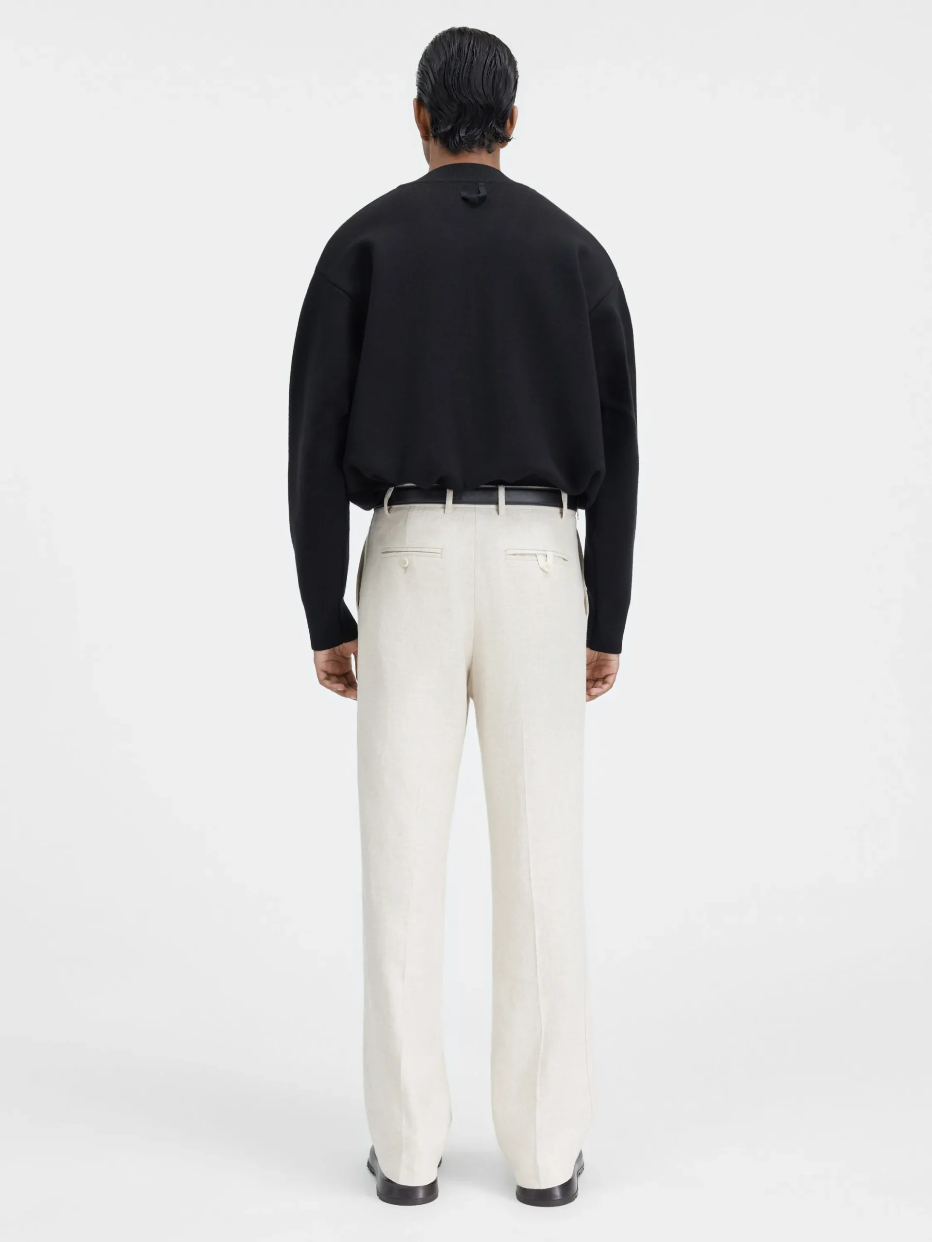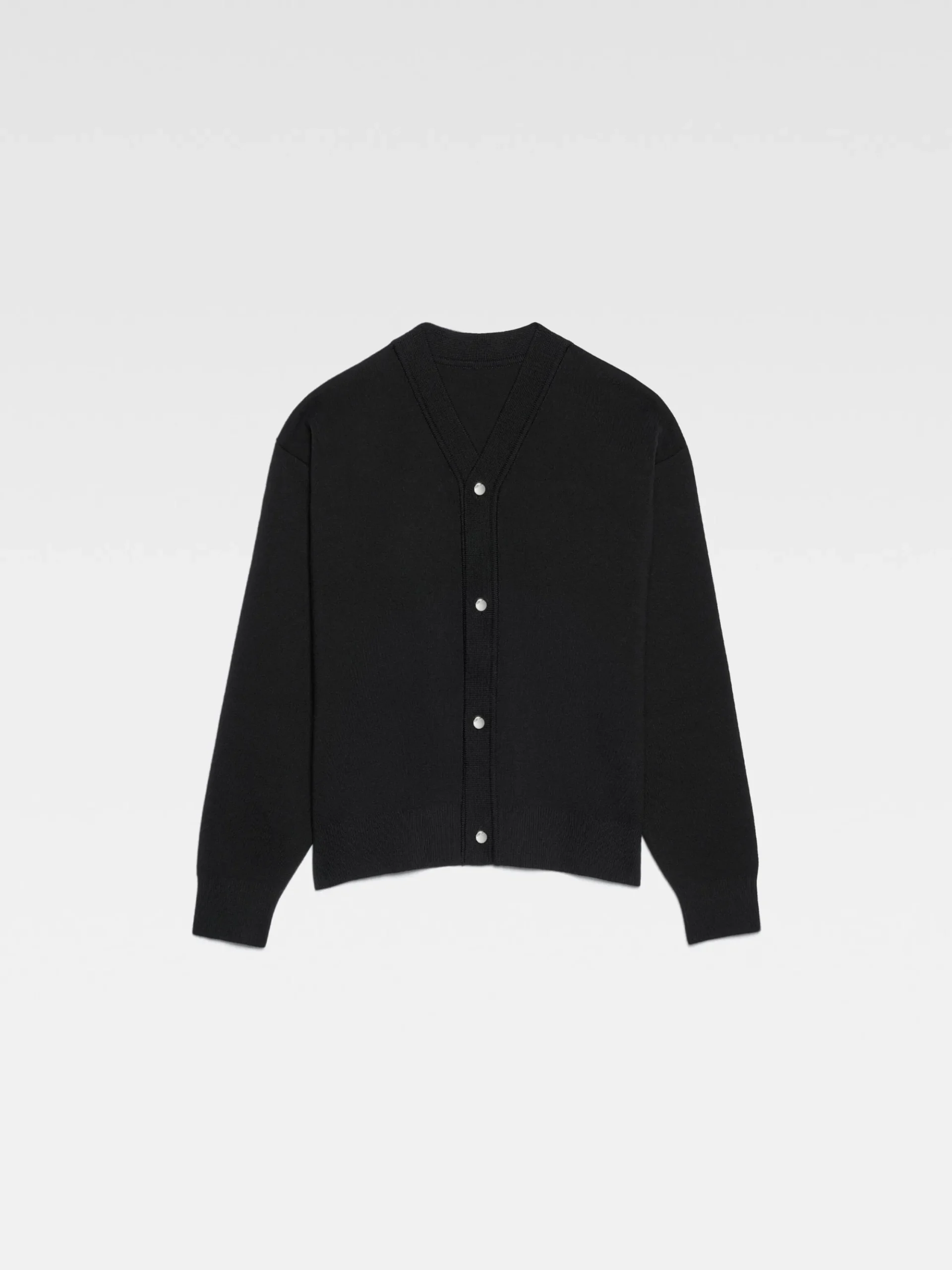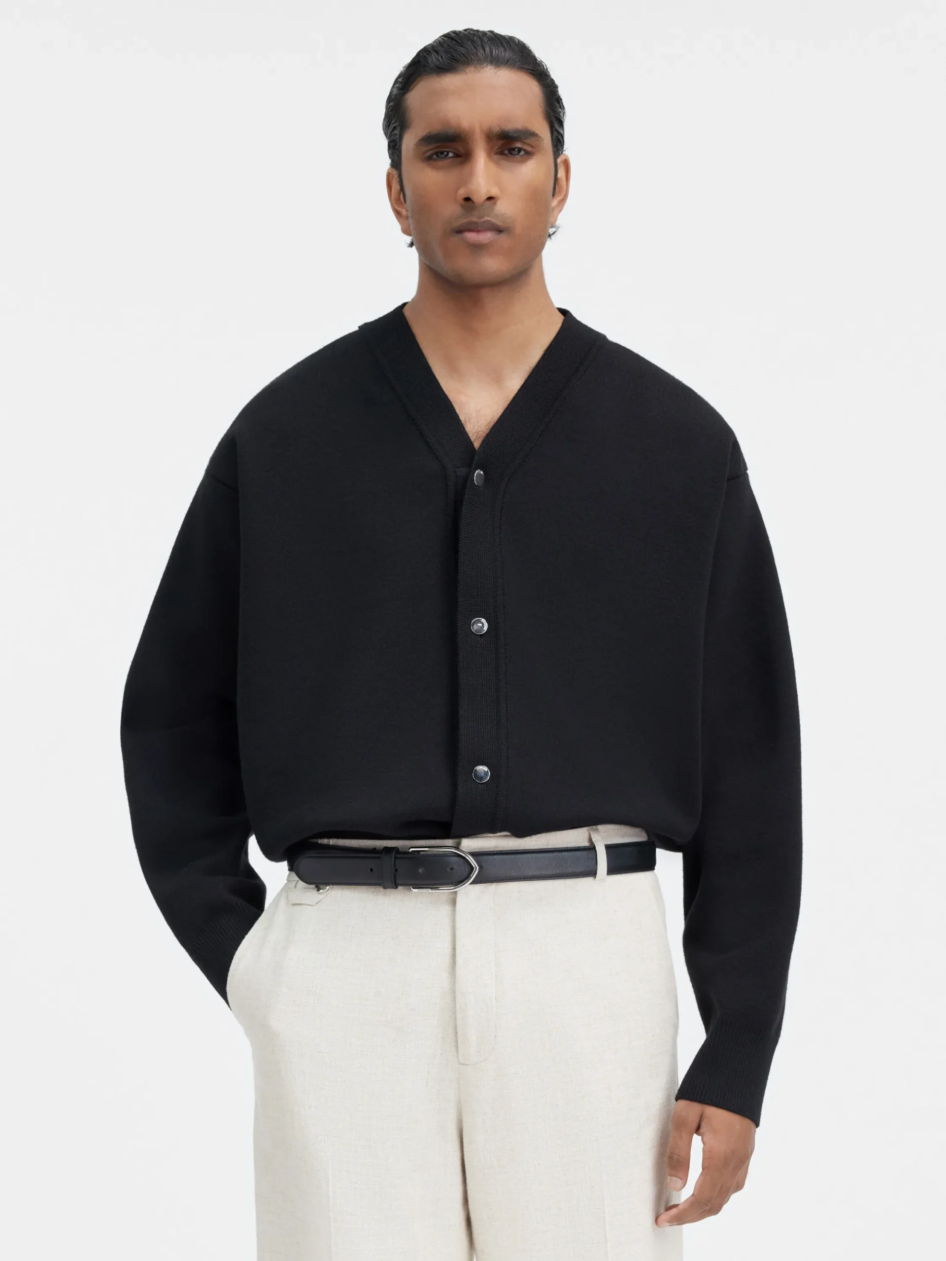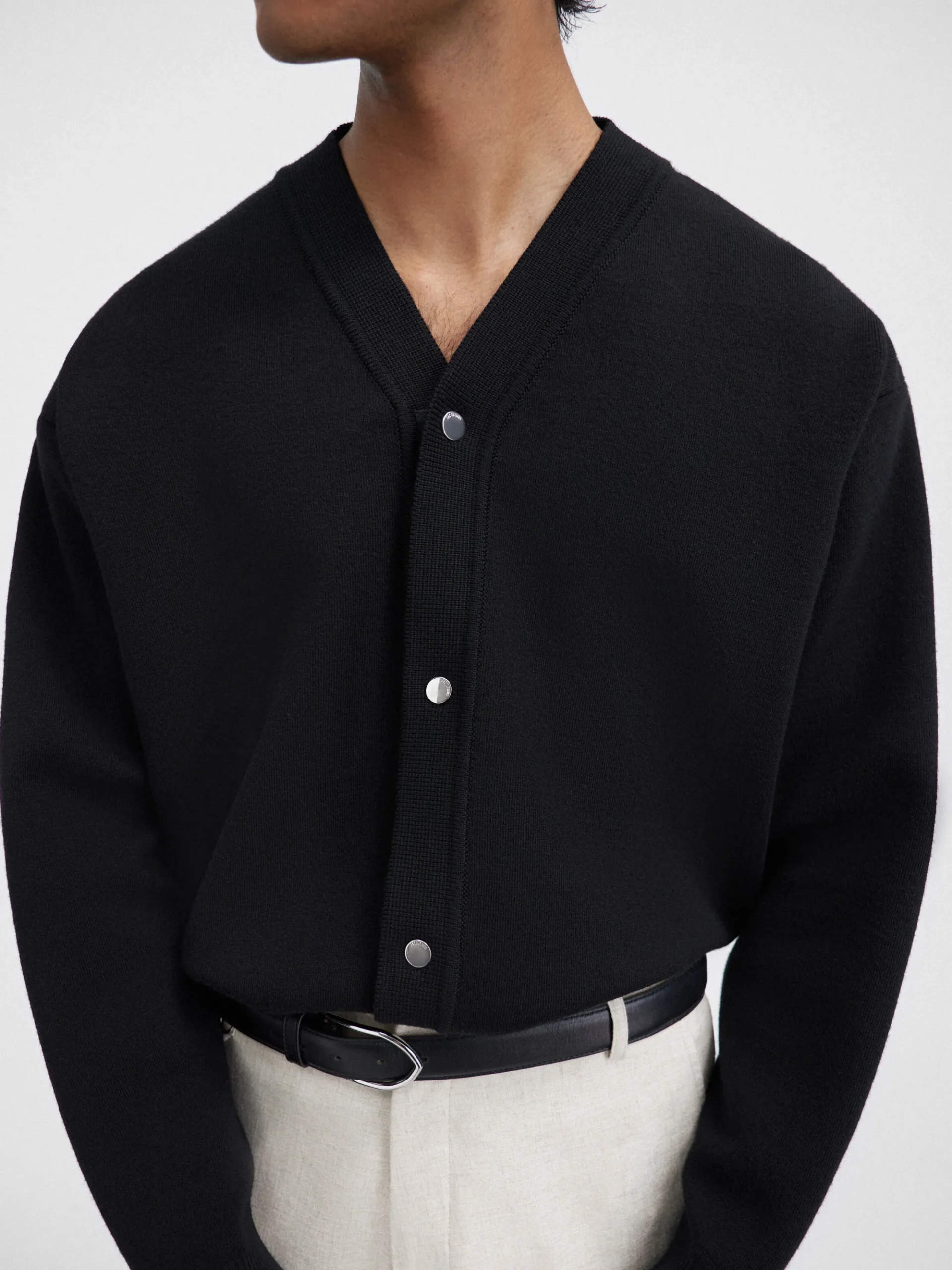Zilverkleurige metalen knopen met gegraveerd logoHet model is 186cm lang en draagt maat M.